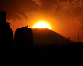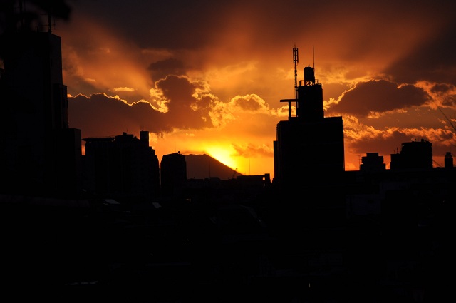 今日は雲ひとつない晴天で富士に沈む太陽は